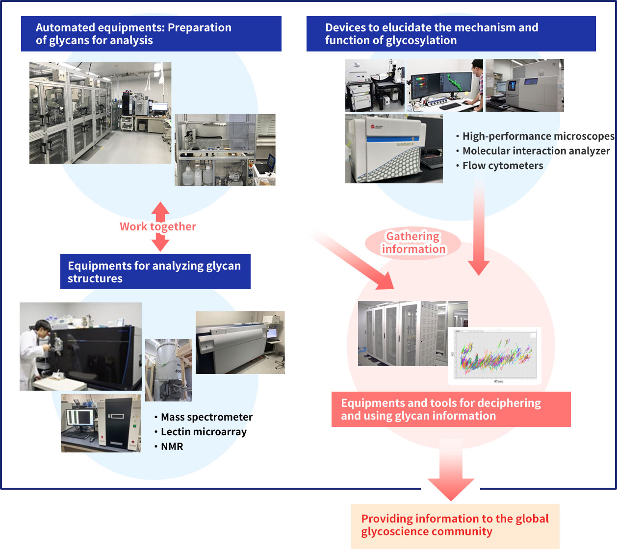 In HGA project, instruments and devices have been brought together to construct a comprehensive glycan analysis system and to develop automated equipments. We are preparing facilities that enable researchers with various technologies and methods to engage in comprehensive glycoscience research.