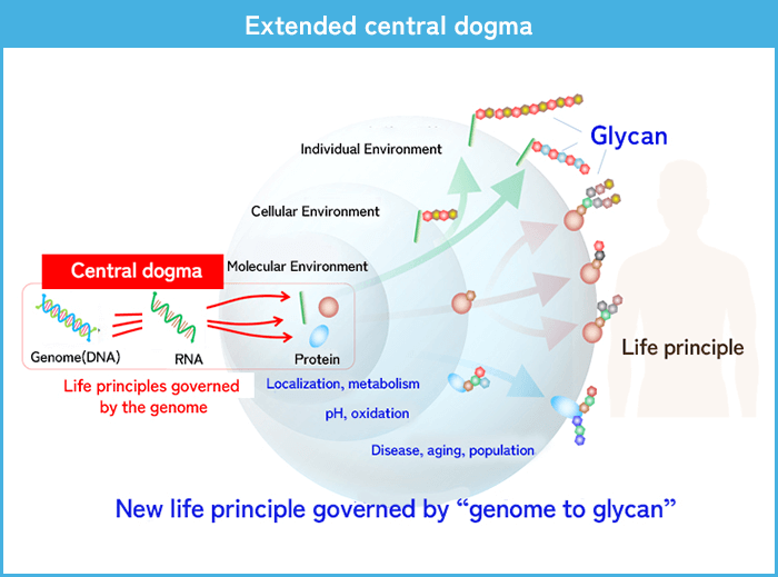 The scientific goal of this project is to establish the basis of “extended central dogma,” which adds information on glycans to the existing principle. This will contribute to deeper understanding of life and innovation in medicine.