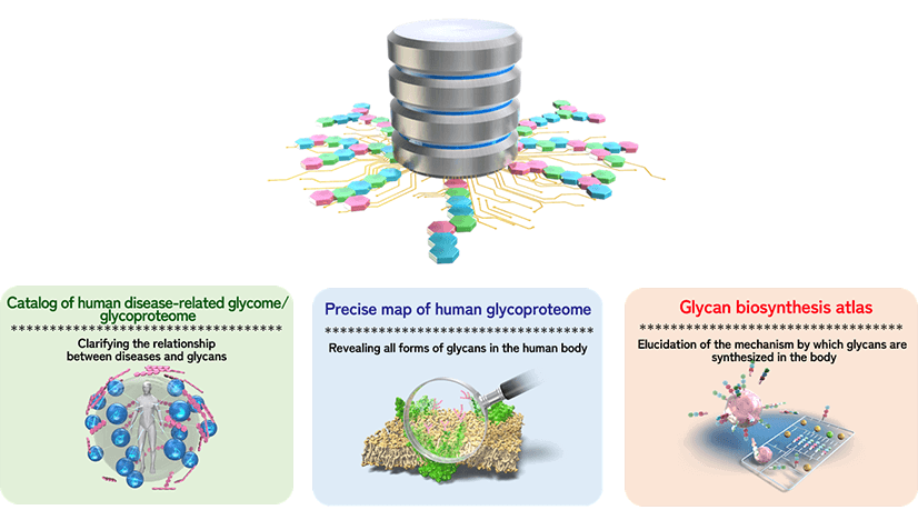 Specifically, the project aims to comprehensively obtain information on the structures of “glycans” in the human body, the relationship between diseases and “glycans,” and the mechanism by which “glycans” are produced. We will build such information into a knowledge base* that can be used by people all around the world.